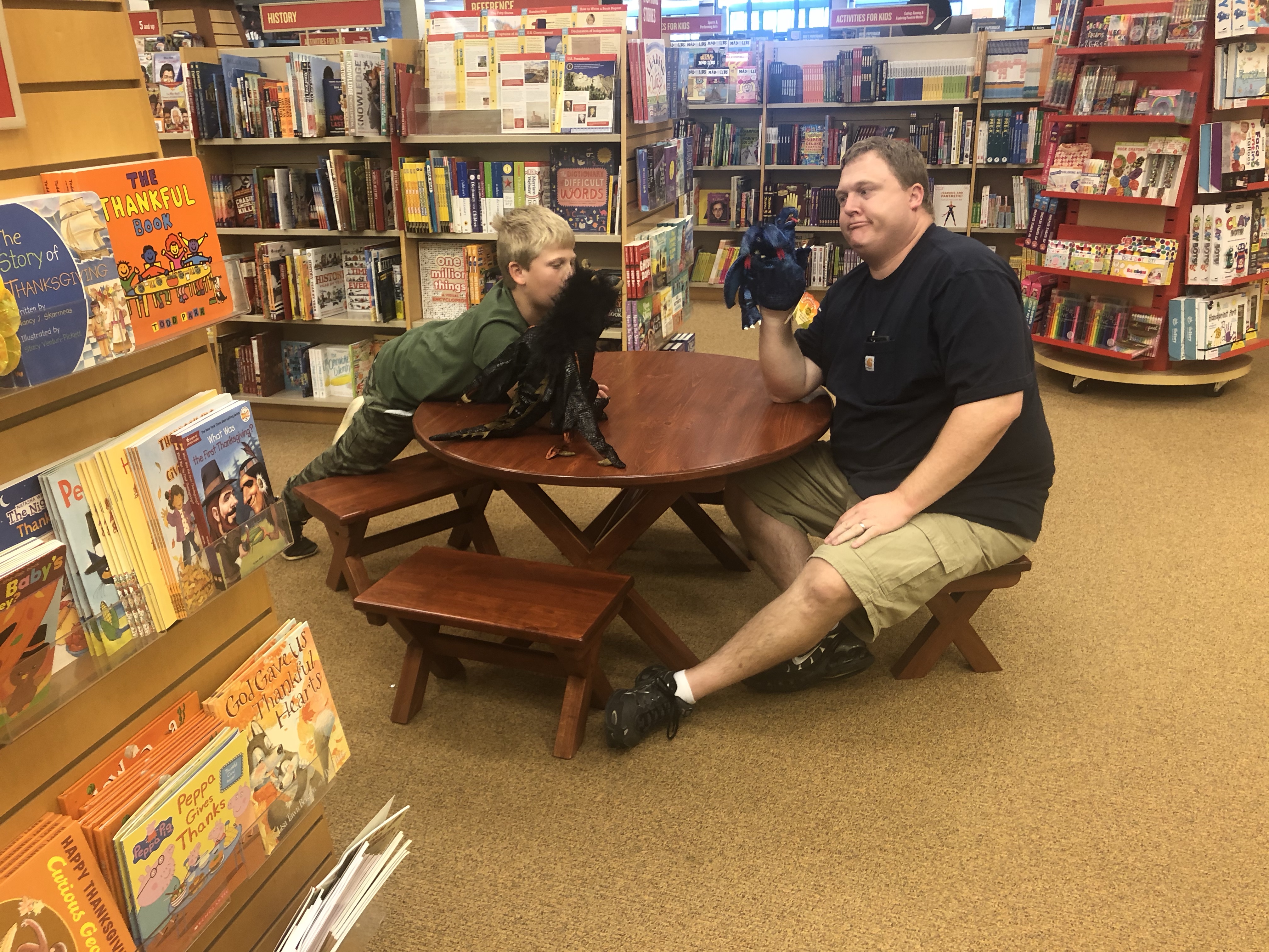Alex and K.J. playing with puppets at Barnes and Noble.
